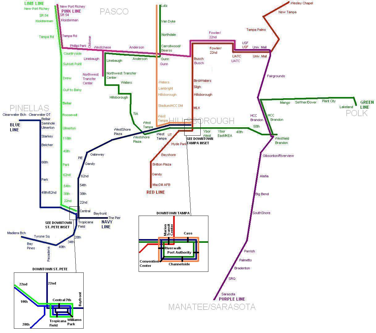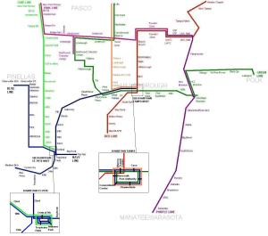 This is a map of what I think Tampa’s light rail system should look like. Many destinations throughout the bay area are served, with others still not listed in the outskirt counties.