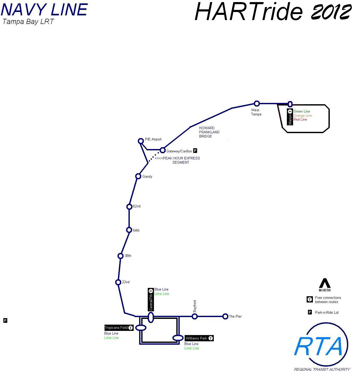 Here it is, after a few teaks, the Navy Line. This route would connect St. Pete to Tampa via the I-275 corridor. Notice how the route connects St. Pete/Clearwater International Airport; there is a bypass that would be used during peak hours.