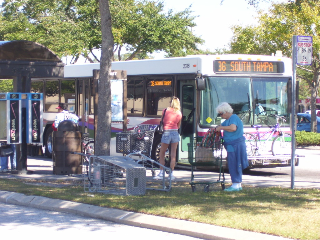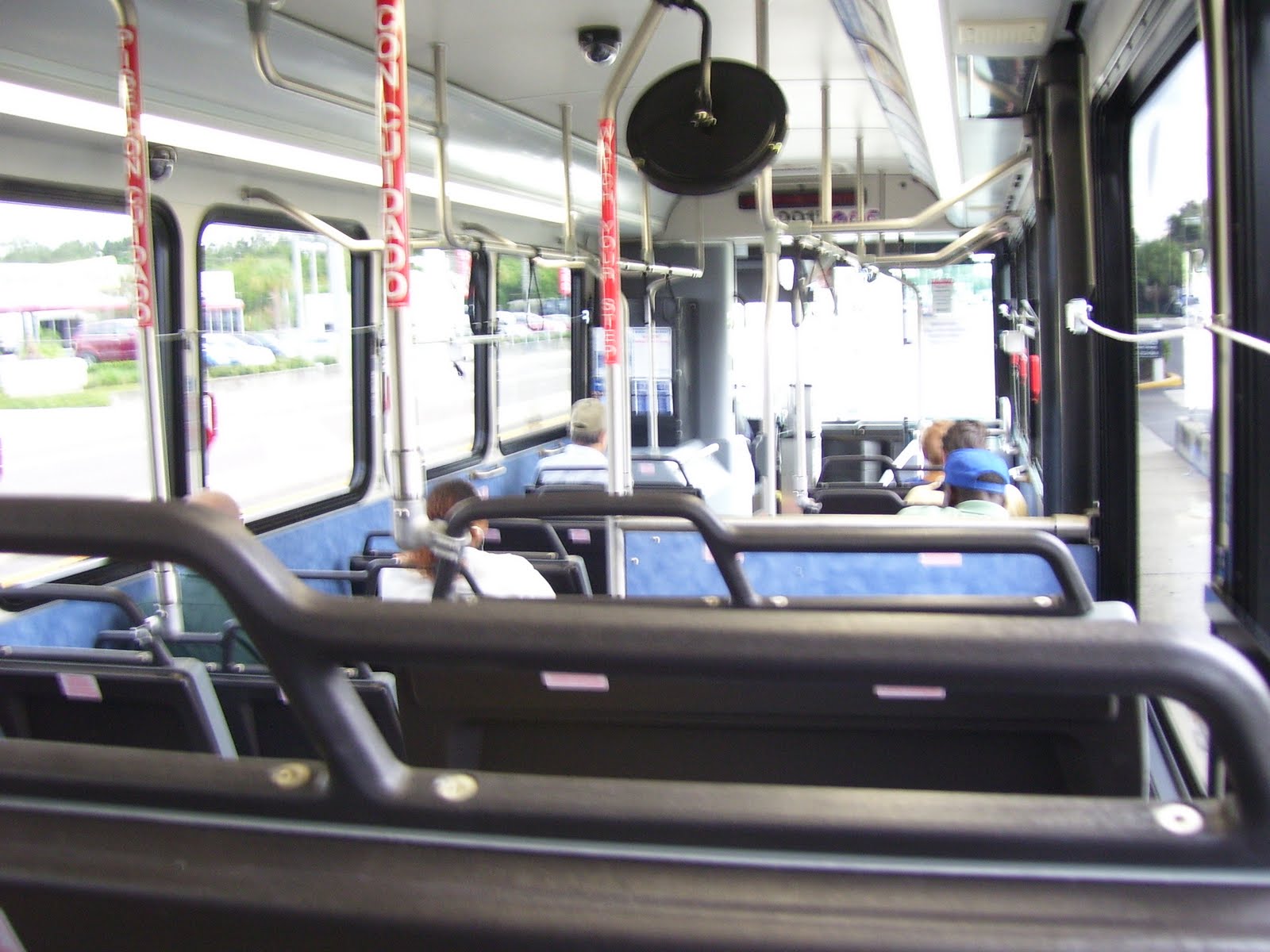 This is the interior of a Gillig Low Floor bus operated by HART. You can see that the higher level is towards the back of the bus, rather than the entire bus. This allows passengers who may have difficulty boarding the bus to sit closer to the front of the bus without having to climb steps. The seating arrangement differs vastly depending on the agency. With many newer buses that HART has purchased, the aim is to have front-facing seats throughout the entire bus, while SCAT & PSTA have opted for sideways-facing seats in the front and rear sections of their buses.