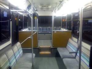 This is the interior of a Gillig Phantom bus from HART. Many older models, like this one, had plush seating and rear door wheelchair lifts. Newer models had the wheelchair lifts in the front door of the bus. Gillig manufactured the Phantom from 1980 to 2008, when the company refocused their efforts on building low-floor buses. Today, the Phantom remains in use at many transit agencies, but during the years to come, they will be gradually phased out.