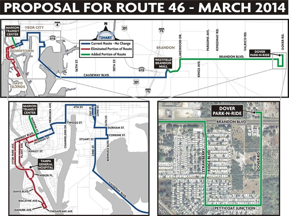 With demand increasing, and funds being available again, HART will be restoring midday service to Route 46 during its November, 2013 markup. Additionally, HART is now proposing that the Davis Island segment be eliminated in favor of an eastern extension towards the Dover Park-N-Ride Lot off State Road 60 (currently served by Route 22X). If the latter change goes through, the western terminus of Route 46 would shift to the Marion Transit Center in downtown Tampa.