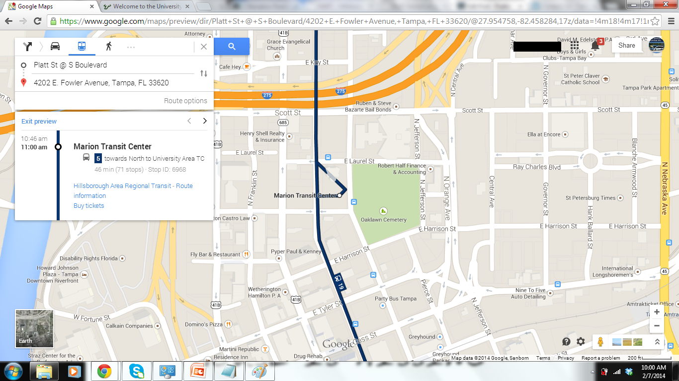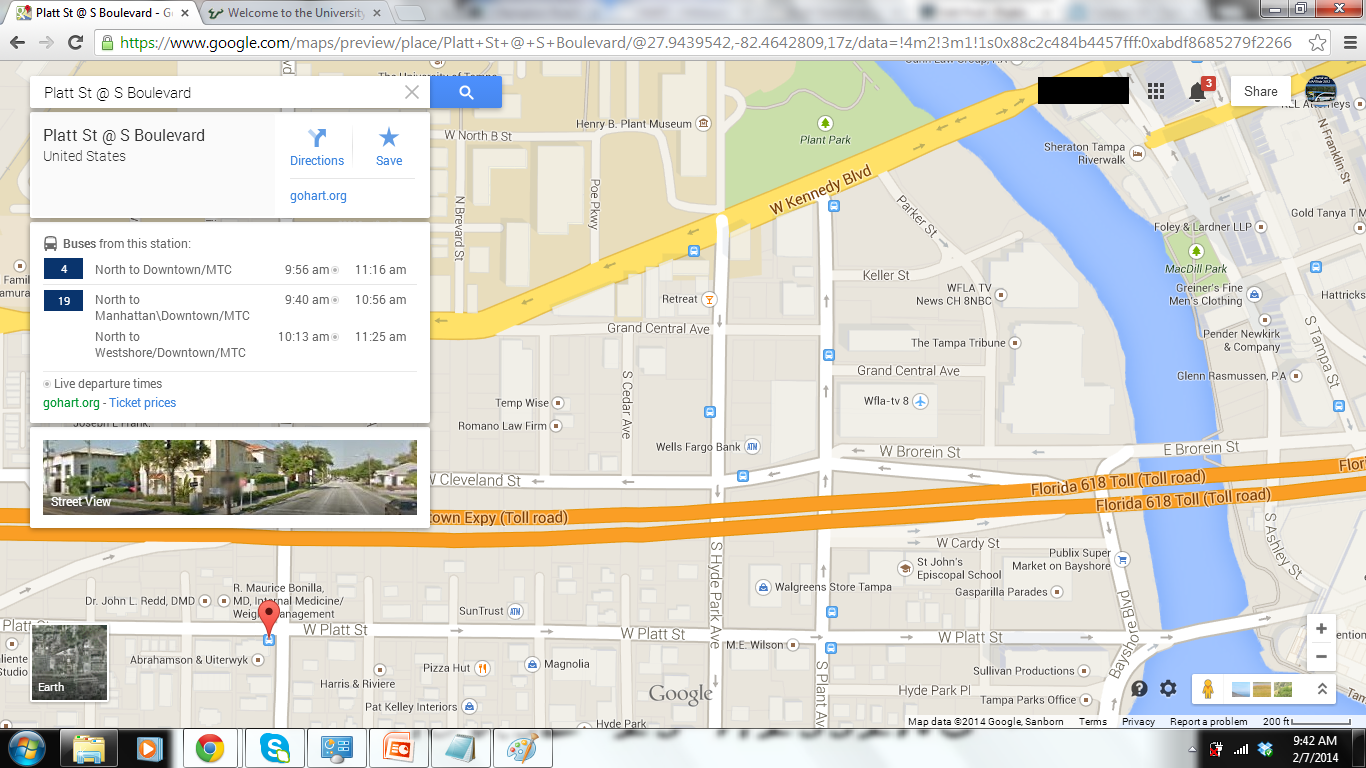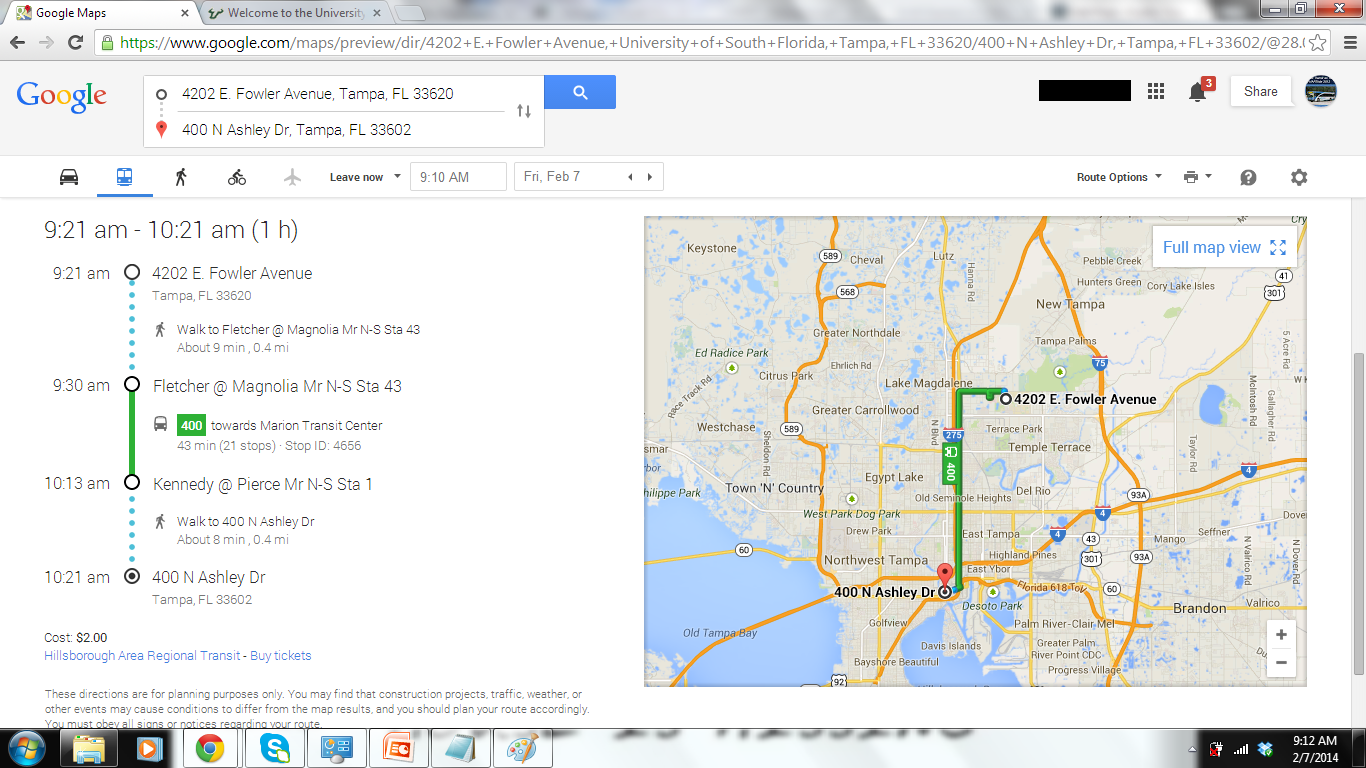 Now, let’s do a quick “to” and “from” using the search box. For this demonstration, I’ve chosen the USF Tampa Campus as my origin, and the Rivergate Tower at 400 N Ashley Dr in Downtown Tampa as my destination.