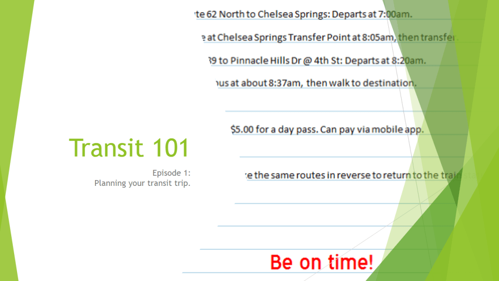 Regardless of what method you choose to to plan your transit journey, please always keep in mind to have everything planned out prior to leaving for the bus or rail stop, and always arrive at the stop at least five to ten minutes prior to the scheduled arrival time. If inclement weather should arise, please arrive at your stop at least ten to fifteen minutes prior to the scheduled arrival time.