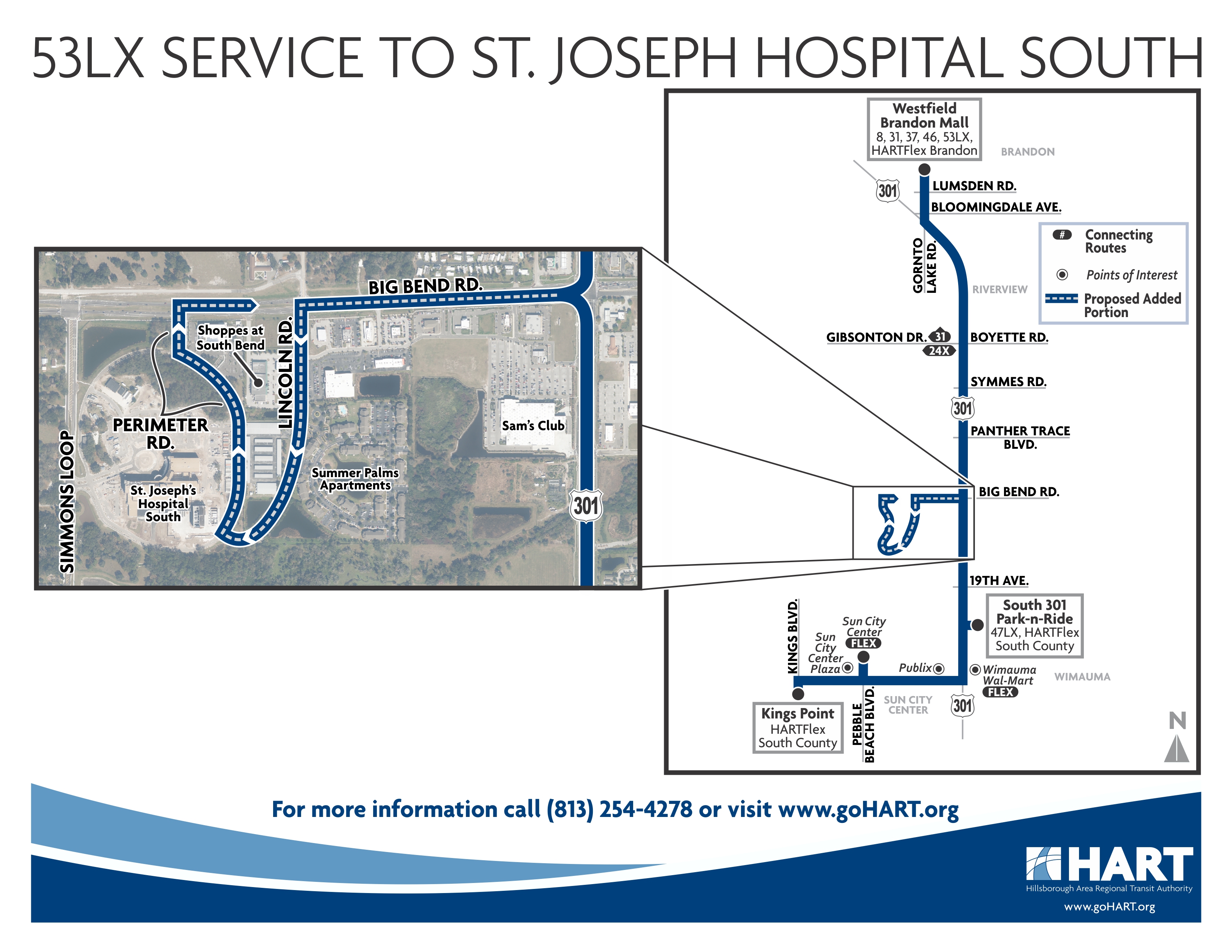 As mentioned a couple of weeks ago, HART Route 53LX will be modified to serve the new St. Joseph’s Hospital South campus off of Big Bend Rd near US 301. As of February 16, 2015, those modifications have taken effect. You will be able to access the adjusted schedules online soon.