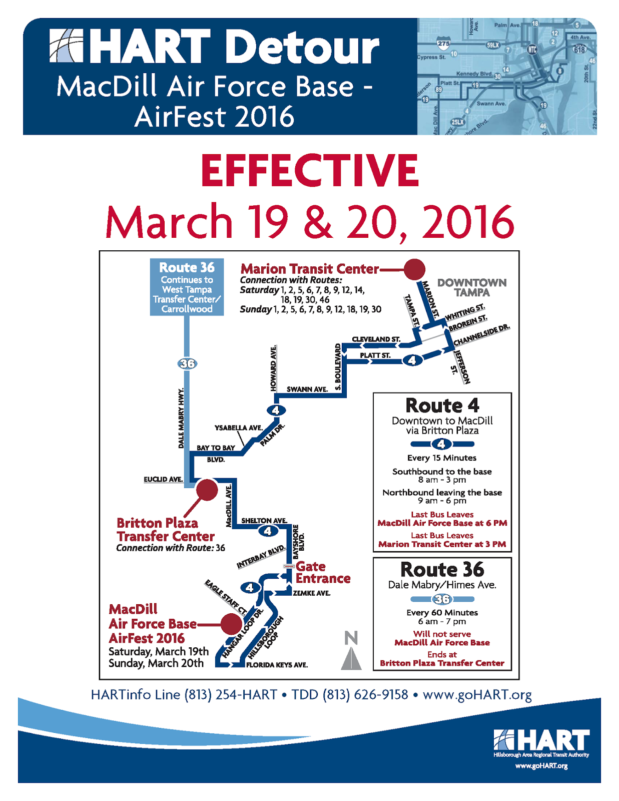 As with previous events, traffic congestion throughout South Tampa will be very heavy, so you will want to leave early and be prepared to brave the crowds…both at the event and while on the road. If you want to avoid the traffic and parking hassles, I strongly encourage you to use transit to get to and from the event. As with many previous events, Hillsborough Area Regional Transit (HART) is partnering with MacDill Air Force Base to provide bus transportation via a modified Route 4. Route 4 normally operates hourly on weekdays only, but will be operating roughly every 15 minutes on both days.