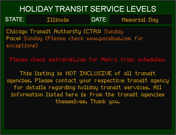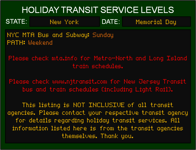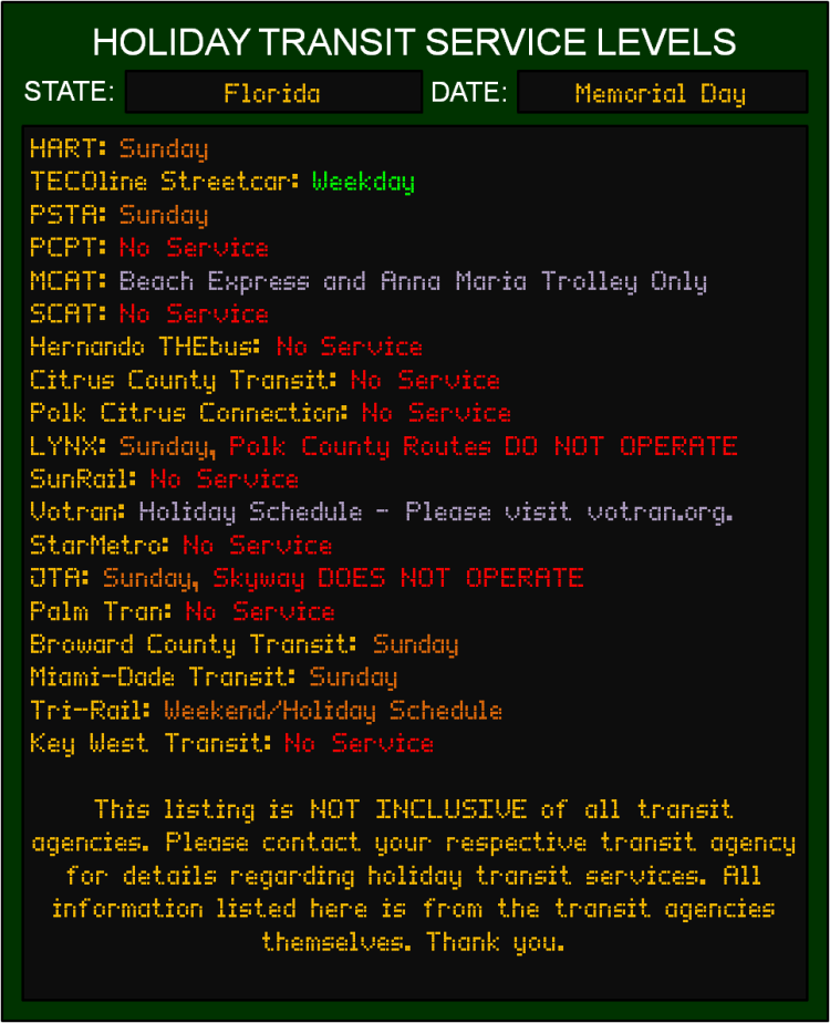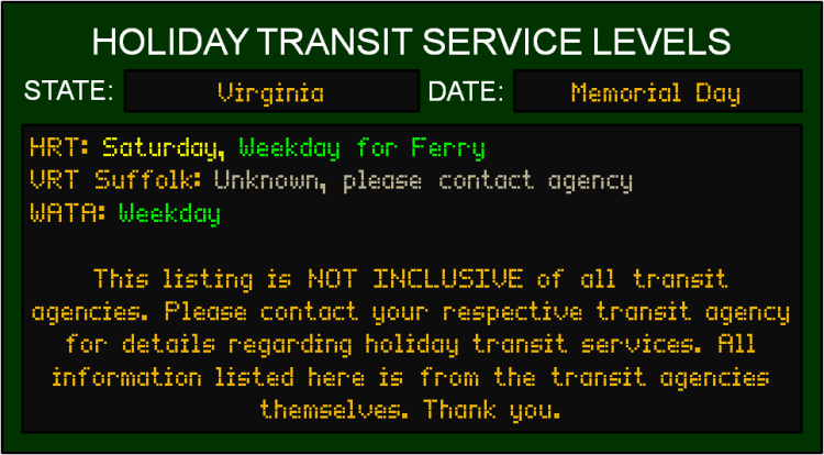 Like most Federal Holidays, most transit agencies will be running limited services, with some agencies not running services at all. If you plan on using transit on Memorial Day, please plan your day accordingly…and in ahead, as customer service lines may be closed.
