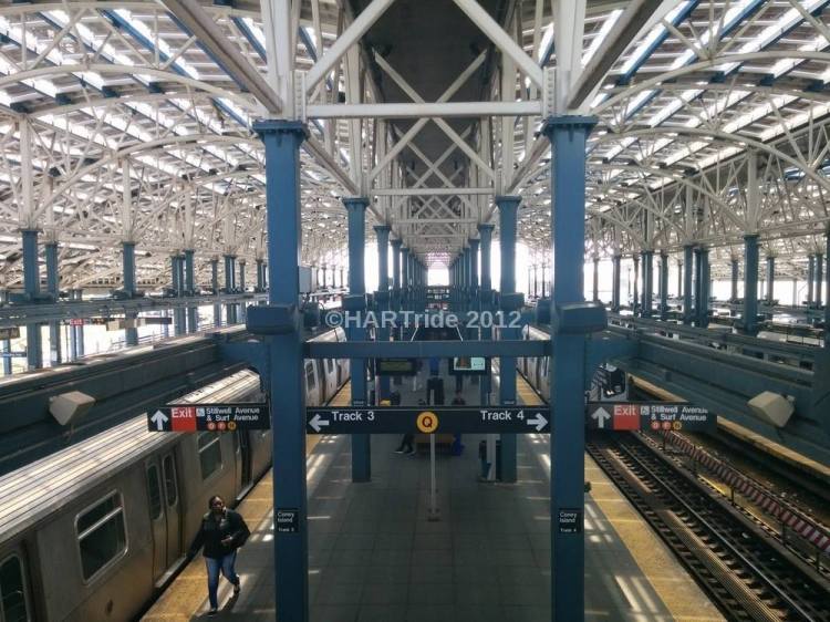 Returning from my 2017 New York City Transit Excursion, I present to you this wonderful vantage point of the Coney Island – Stillwell Ave Subway Station. The station serves as the southern terminus for the (D), (F), (N), and (Q) trains, though occasionally, you’ll see other lines being detoured here. Most recently, the (G) train has been detoured here several times due to maintenance on other tracks that prevent the (F) from serving the station. At one time, the train served the terminal when it served the West End Line. West End service was replaced by the (D) train in 2005.