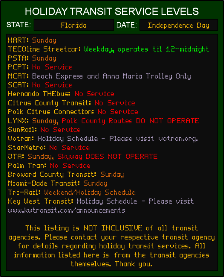 Volusia County Transit (Votran) will operate a modified holiday schedule. Since SunRail will not be operating on July 4, neither will the SunRail Feeder bus routes – 31, 32, and 33. Please read the following from the Votran website carefully: