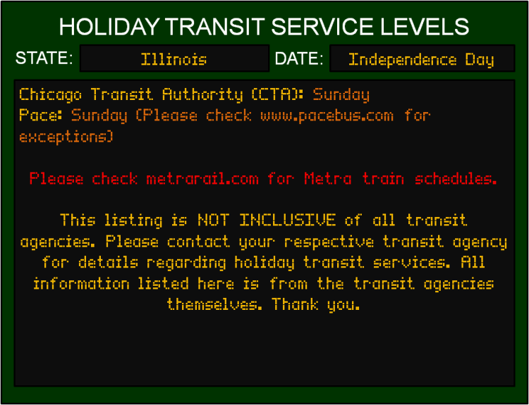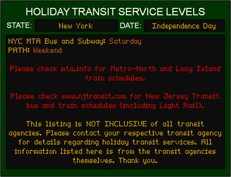 Independence Day will be on Tuesday, July 4, 2017. For Monday, July 3, 2017, most transit agencies will operate normal weekday services. However, you should contact your respective agency just to make sure there are no service exceptions. For Tuesday, July 4, 2017, most transit agencies will operate limited to no services. As always, please keep this in mind as you plan your holiday festivities and make alternate arrangements if possible. In some municipalities, transit agencies may provide modified services to assist with getting people to and from Independence Day events such as evening firework displays.