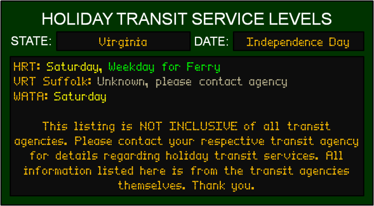 Hampton Roads Transit (HRT) may detour some Downtown Norfolk bus routes due to evening firework displays. The Tide Light Rail, though operating on a Saturday schedule, may be modified to help people get to and from Park-N-Ride lots along the line. The Elizabeth River Ferry will run modified services through 12-midnight to help people get to and from the firework displays. For the latest information, please visit www.gohrt.com.
