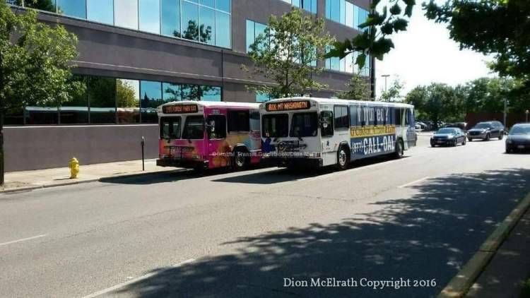 For the month of August, my photo contributor Dion M. took this neat photo of two Cincinnati Metro Transit buses passing each other near the heart of the city. Cincinnati Metro Transit in Cincinnati, OH still operates a line of Gillig Phantom high floor transit buses, though they are slowly being replaced by newer low floor buses.