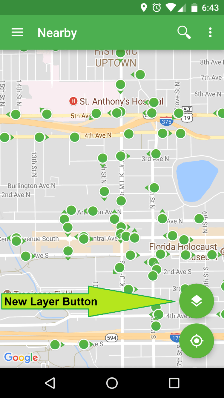 When you open up the OBA app, you’ll notice the new Layer button above the Geolocation button. Tap the Layer button to view the options available.