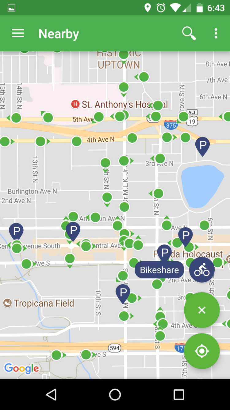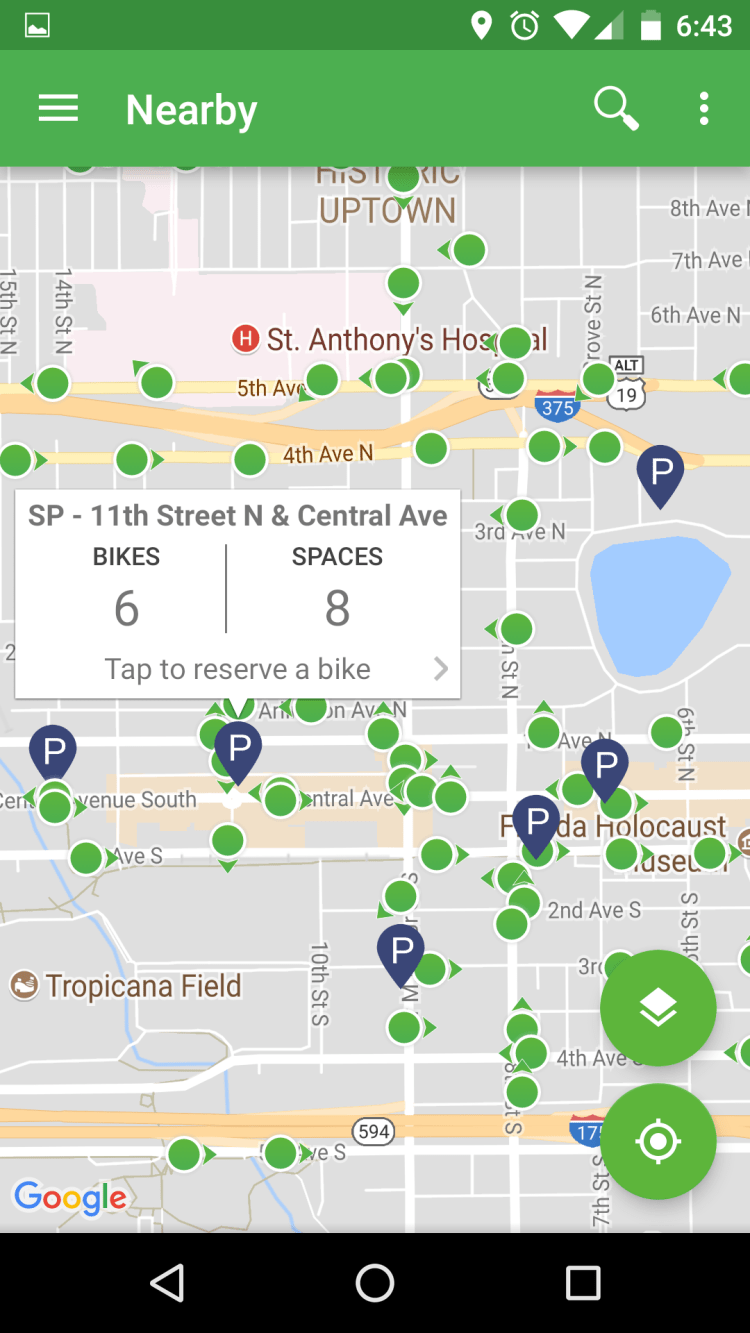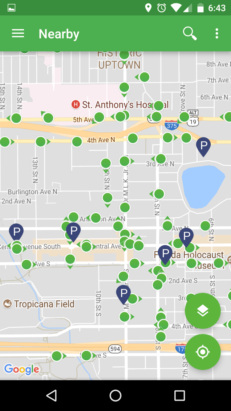 Now you can view all of the Coast Bike Share hubs, indicated by the blue “P” marker. These will show in both Hillsborough and Pinellas counties – allowing you to plan what bus route to take to your particular destination AND view where the closest Coast hub is to your destination bus stop.