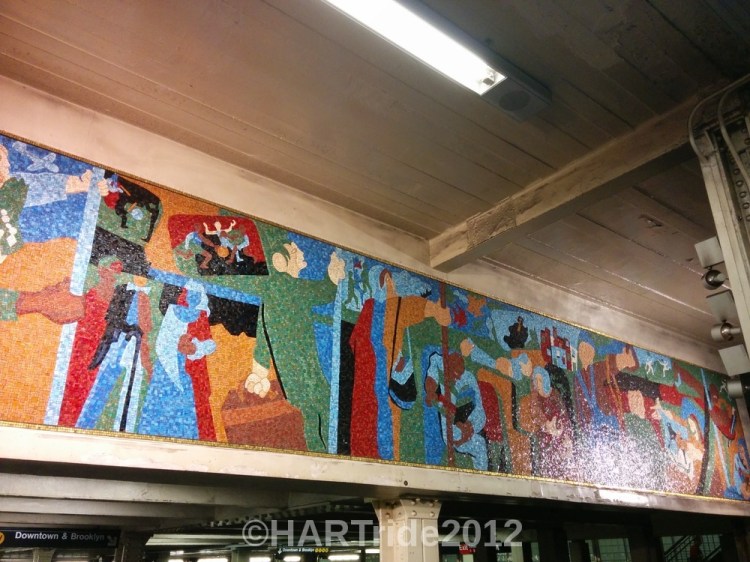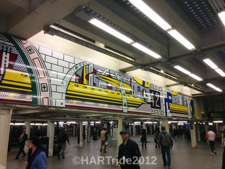 While traveling to the Broadway Line platforms for the (N), (Q), (R), & (W). Trains, I snapped a photo of the Times Square Mural on the mezzanine level near the 42nd St Shuttle platform. It’s truly a wonderful mural, depicting a train traveling through a futuristic city. The work was created by Roy Lichtenstein and commissioned by the MTA’s Arts for Transit program.