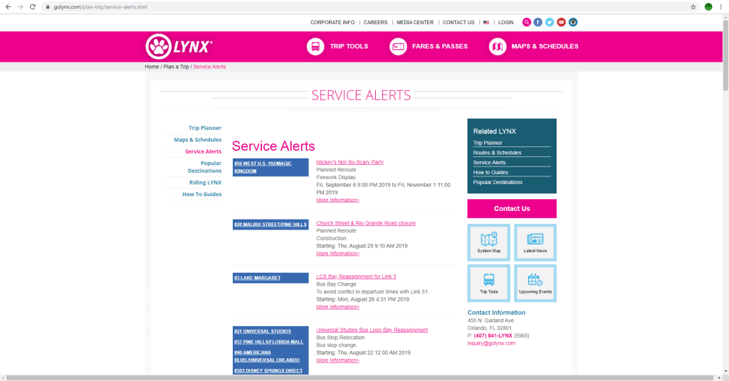 For advisories affecting the Central Florida Regional Transportation Authority (a.k.a. LYNX), please visit the agency’s Service Alerts page.