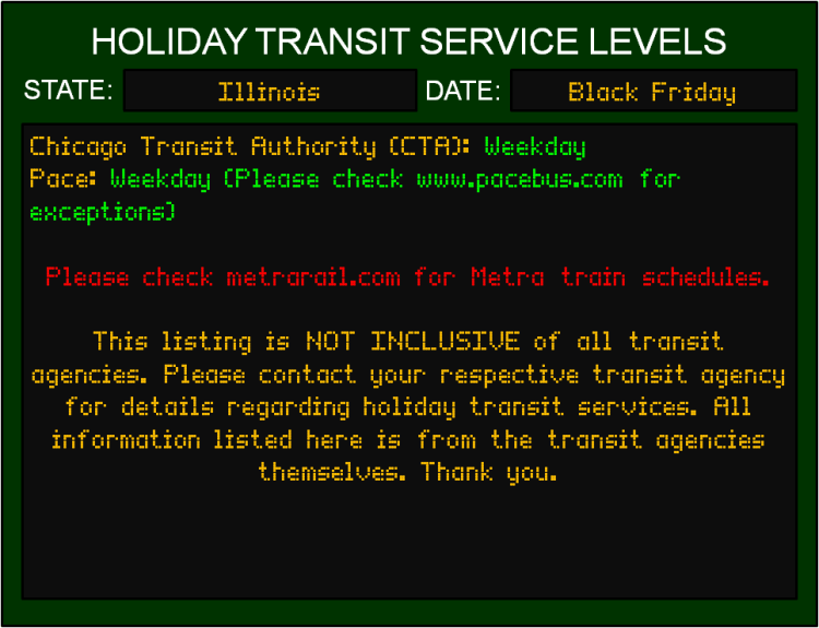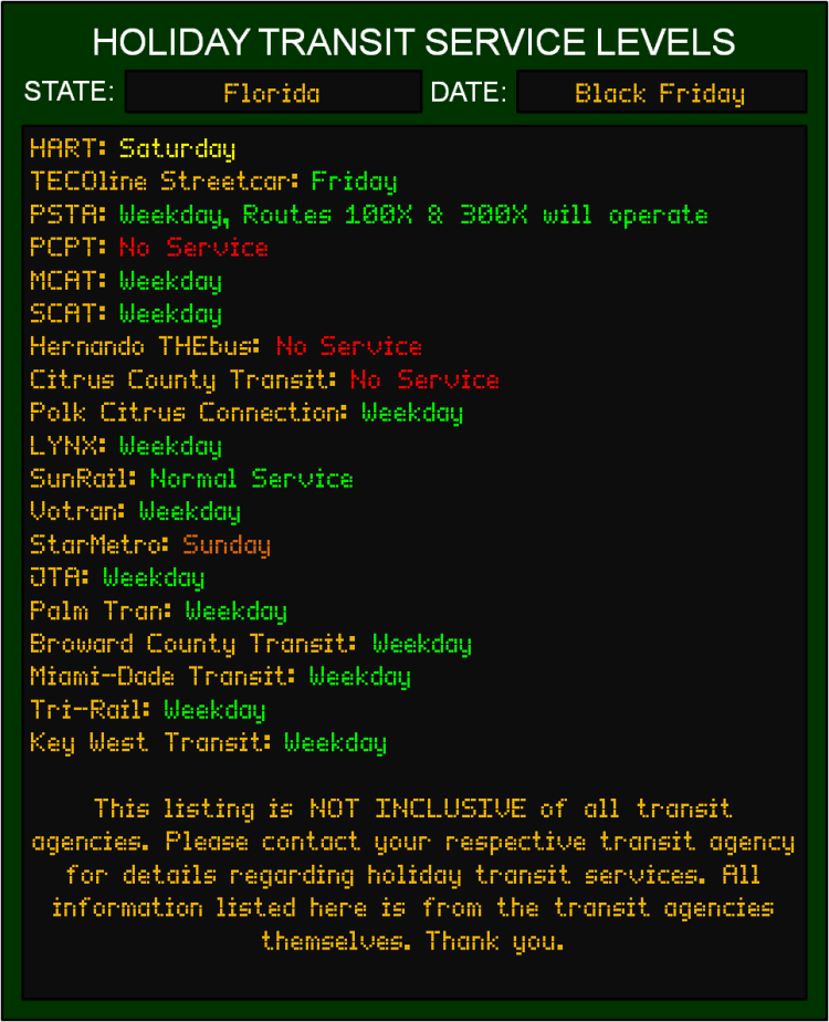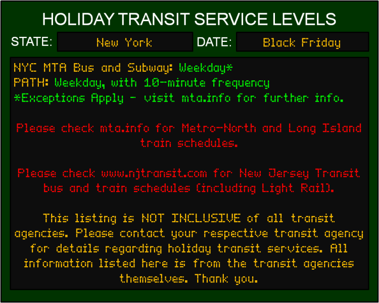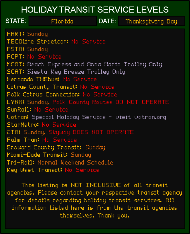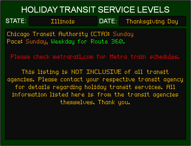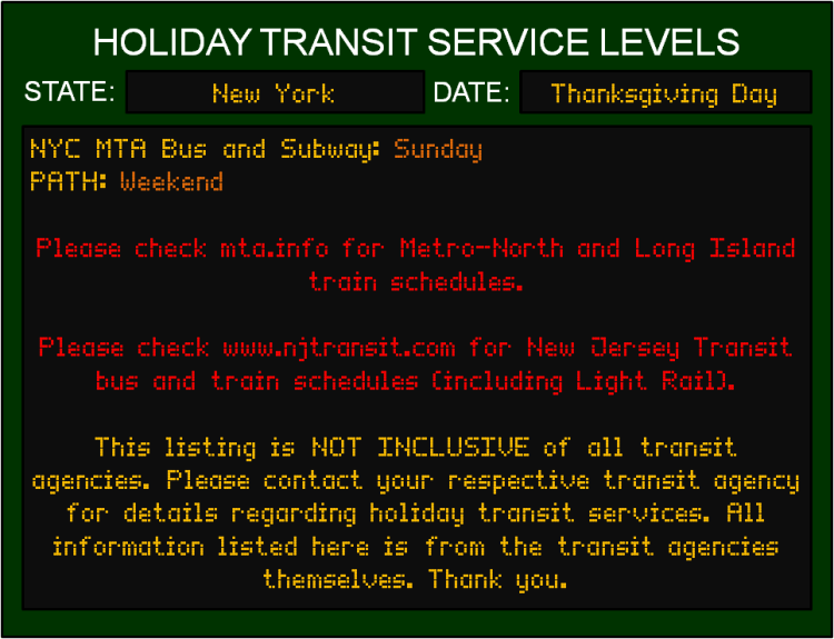 Thanksgiving Day is a wonderful time to spend with family and friends. Whether you plan to stay with family for dinner, or maybe head out evening or Black Friday shopping, I have your scoop to how the many transit agencies that I cover will be operating throughout the Thanksgiving weekend.