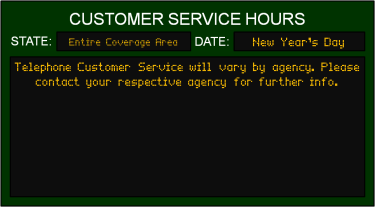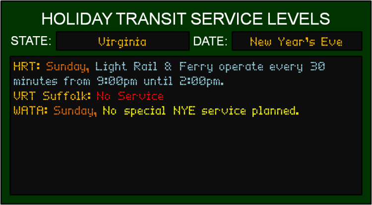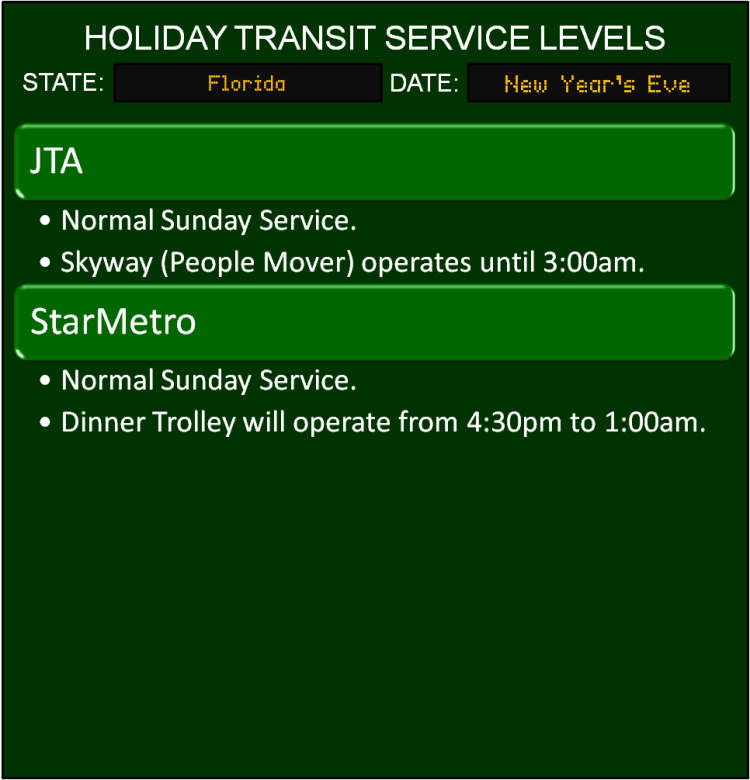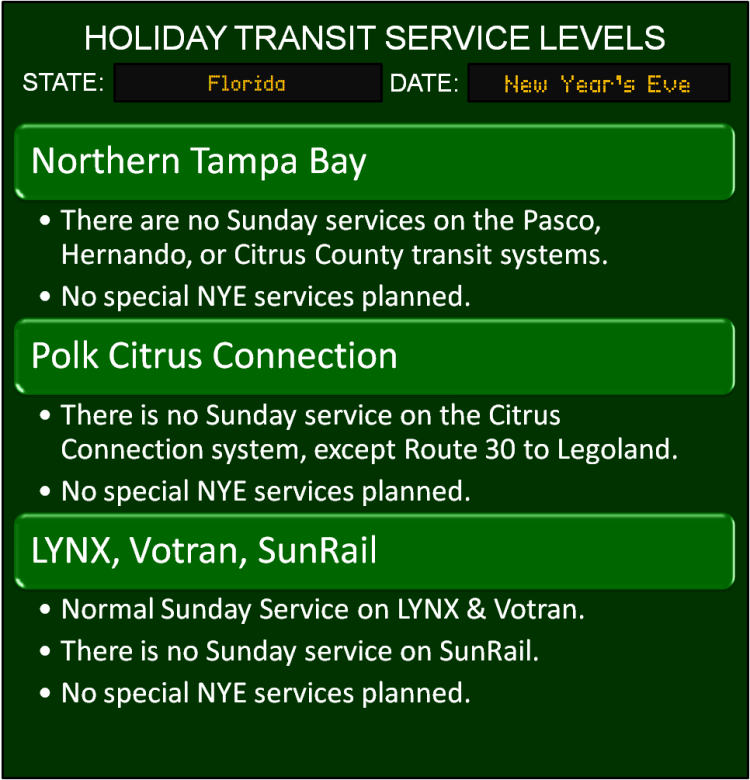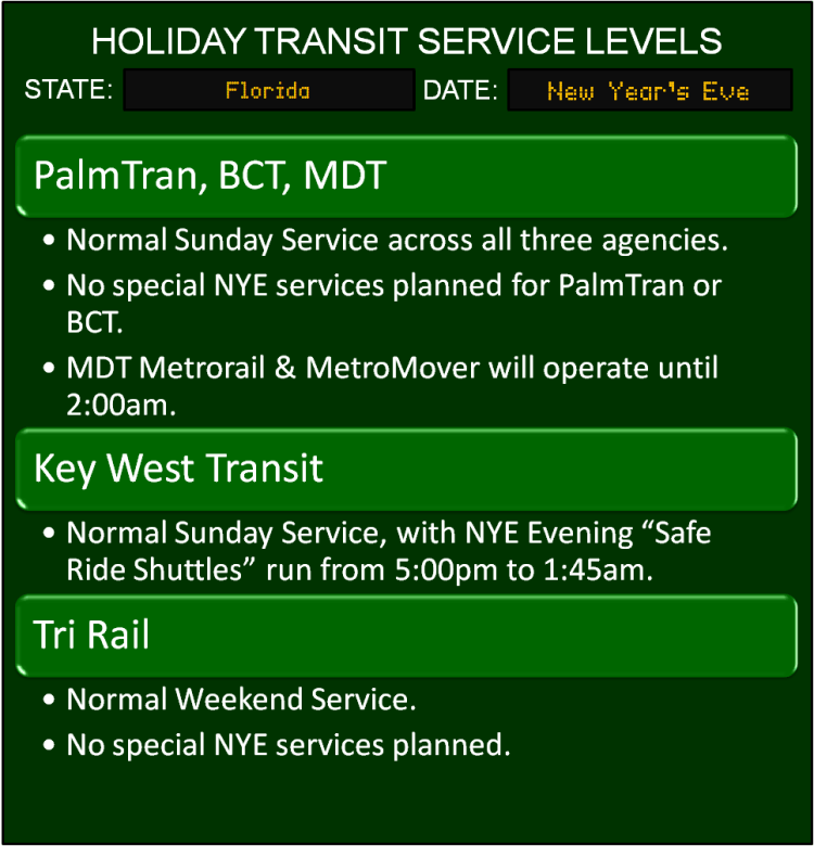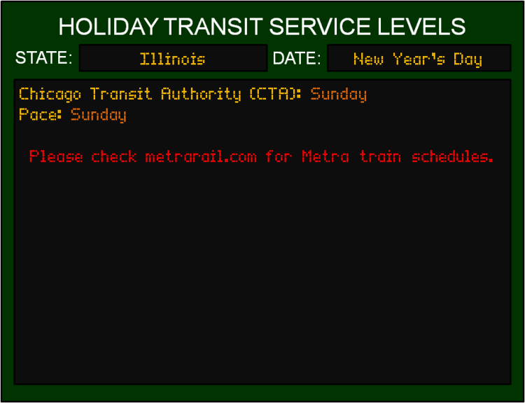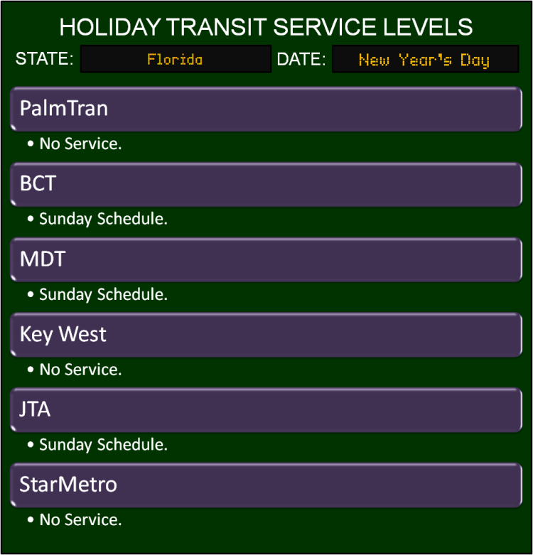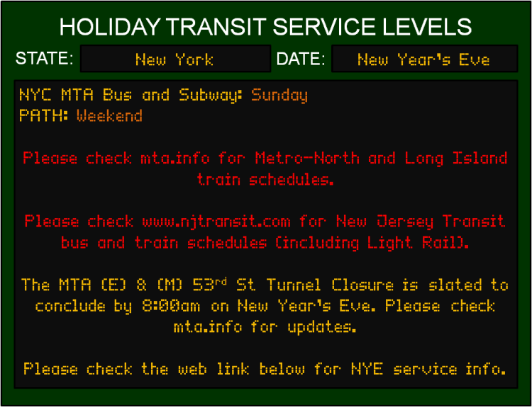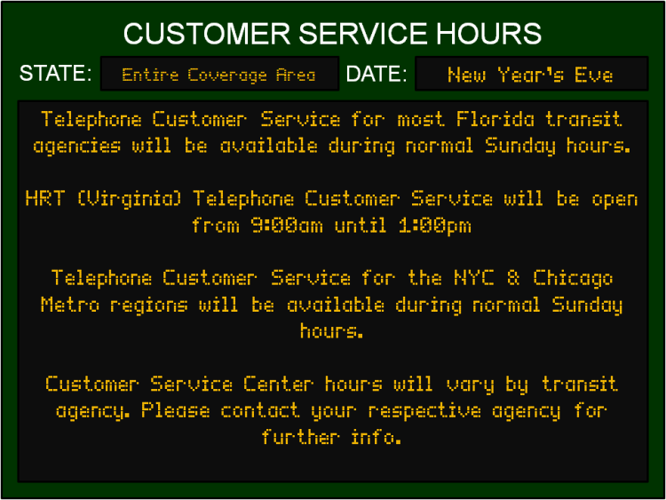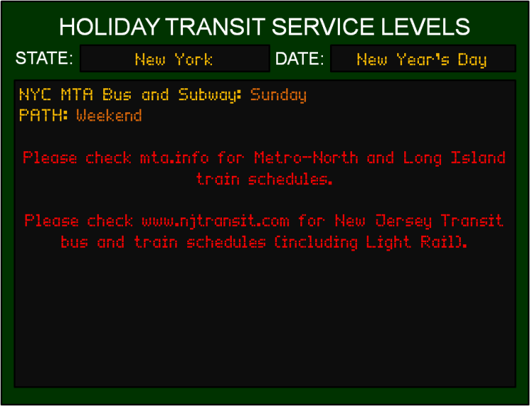 On New Year’s Day (Monday, January 1, 2018), most agencies will be operating limited to no service. Please be sure to contact your respective agency for trip planning inquiries and to get information on any service exceptions. Please note that if your particular transit agency does not normally operate on weekends or does not have a special holiday schedule in place, there may be no service provided.