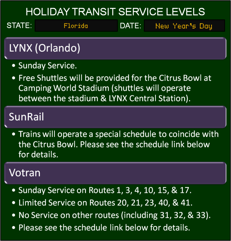 - Votran Holiday Schedules: On the schedules page, select the route you wish to view. For Routes 1, 3, 4, 10, 15, & 17, scroll down to the Sunday Service area of the timetable. For Routes 20, 21, 23, 40, & 41, scroll down to the Holiday Service area of the timetable.