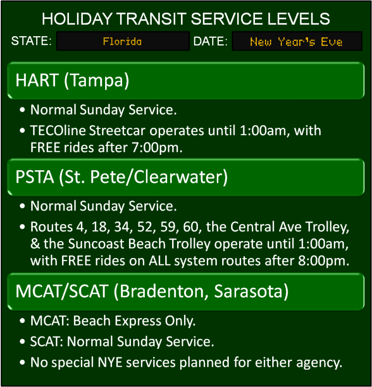 On New Year’s Eve (Sunday, December 31, 2017), many transit agencies are offering extended service with more trains and buses and greater frequency in some cases. Some agencies are even offering FREE rides across all transit modes and routes (with exception to Paratransit and ride-hail “Link” services).