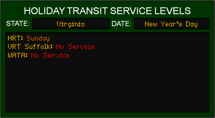 All normal (weekday) transit services will resume on Tuesday, January 2, 2018. Please keep in mind that transit agency administrative offices may be closed this day to observe the New Year’s holiday.