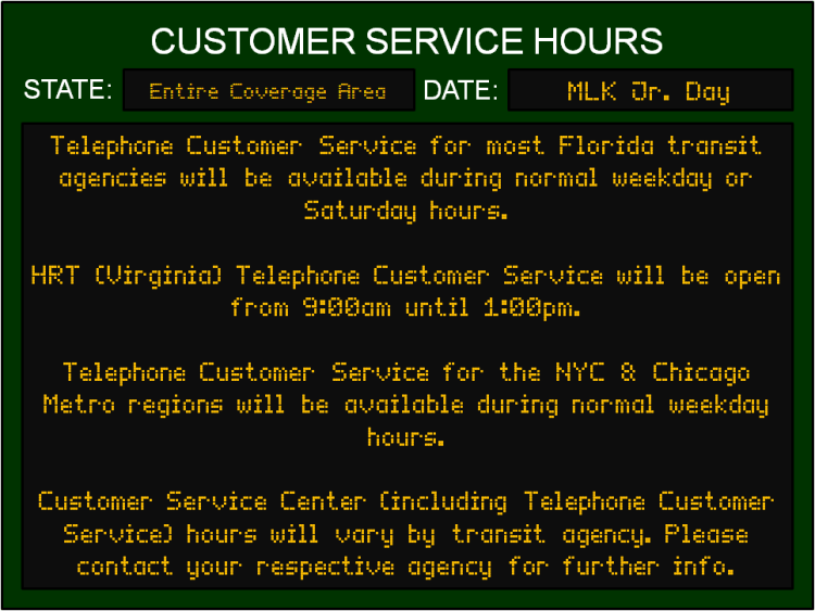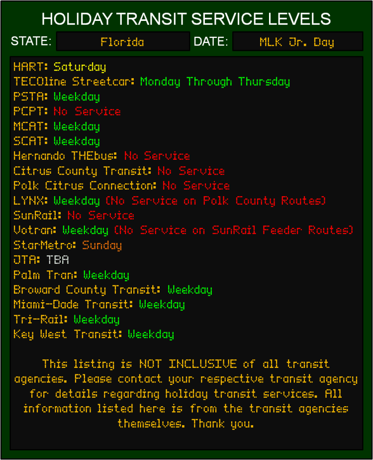 Monday, January 16, 2017 is Dr. Martin Luther King Jr. Day, where we take a moment to celebrate the life and achievements of the famed Civil Rights leader. Unlike most Federal holidays, where transit services are typically limited to weekend-level services, most transit districts tend to operate on a typical weekday schedule on MLK Day. Some districts however may operate on a Saturday schedule or not operate at all.