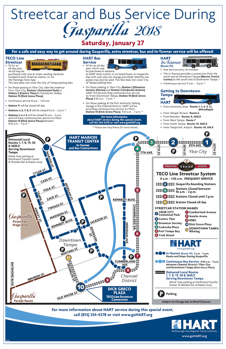Select HART bus routes and the TECOline Streetcar Line will operate on a modified schedule on Saturday, and some bus routes will be detoured due to road closures. I’ll go through a brief rundown of what to expect if you’re using transit to get to and from the parade. For detailed information – including routes that serve the Downtown Tampa area – please visit the HART website, as information can change between now and the day of the parade.