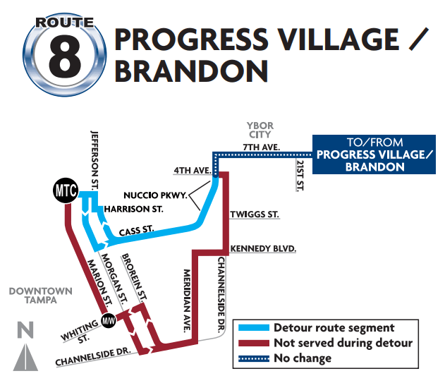 - The In-Towner Saturday Route (Route 97) will operate along its normal route, but will provide frequent service throughout the day. Service will commence at 11:00am and run roughly every 15 to 20 minutes through 9:00pm. Customers may disembark the trolley at stops along Jackson St (inbound to Channelside) or Whiting St (Outbound to Marion Transit Center). OneBusAway tracking will be unavailable.
