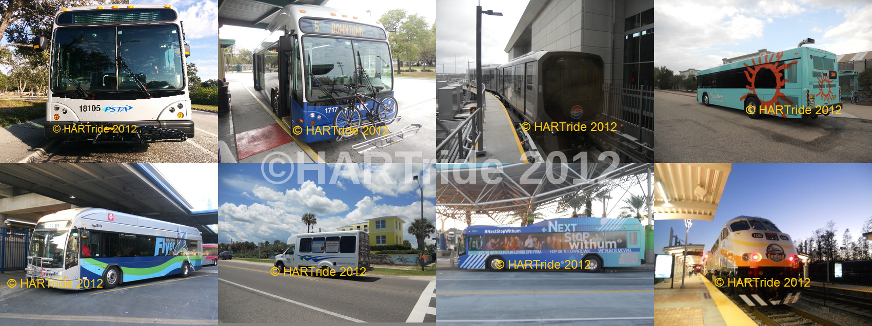 From top to bottom, left to right: Pinellas Suncoast Transit Authority # 18105, Hillsborough Area Regional Transit # 1717, Tampa International Airport SkyConnect # 02, Manatee County Area Transit # 59103, Jacksonville Transportation Authority # B014, Flagler County Public Transportation #99, Central Florida Regional Transportation Authority (d.b.a. LYNX) # 141-313, SunRail locomotive # 105.