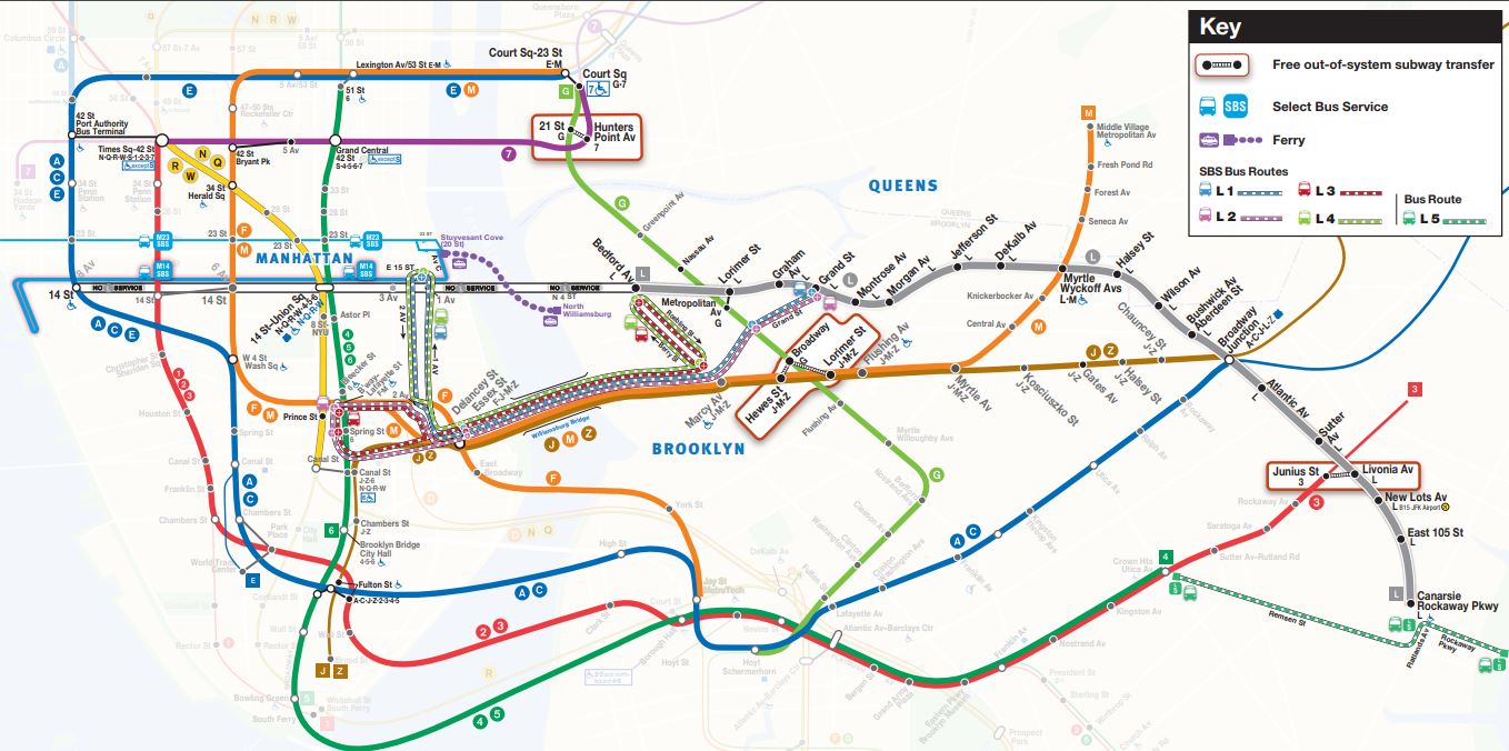 As noted in the above graphic, a temporary ferry service across the East River was to be established, along with five free shuttle bus lines across the Williamsburg Bridge – four of them operating in a Select Bus Service (SBS) format with limited stops. Additionally, an SBS route would have been established along 14th St (M14-SBS), and the existing M23-SBS was to see some sort of modification (likely a frequency increase). Frequency increases &/or other service improvements were also slated for the (7), (A), (C), (E), (F), (G), (J), (M), & (Z) lines.