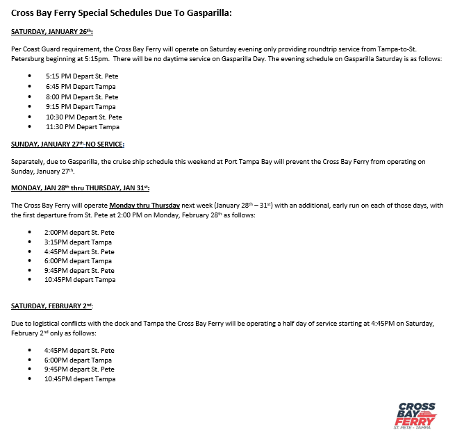 The staff at the Cross-Bay Ferry confirmed their schedule through 02/02/2019 on 01/25/2019. They WILL operate a partial day’s schedule on 01/26/2019. Please see the graphic below for details: