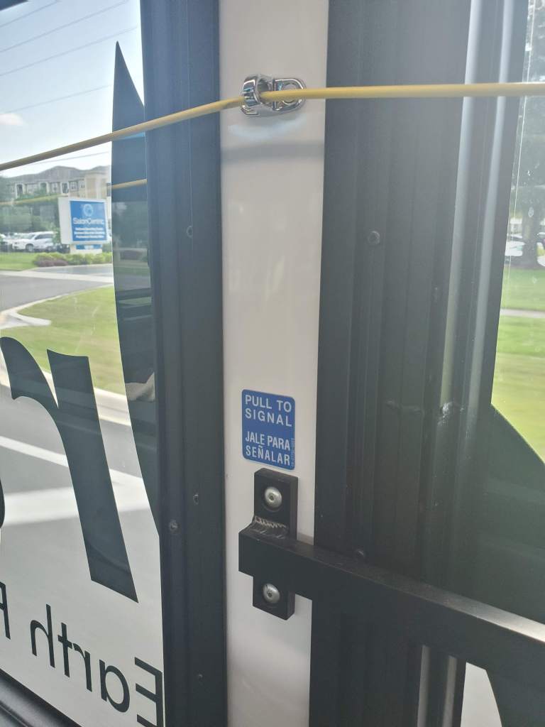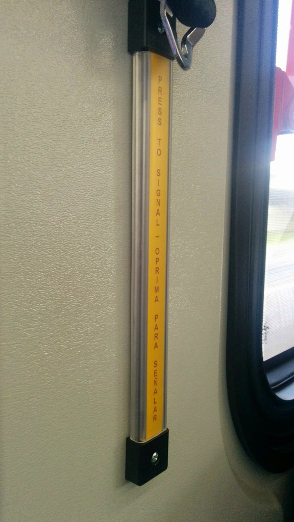 Please note that buses operating on a Bus Rapid Transit (BRT) line may not be equipped with a stop cord or button because the bus is supposed to serve all designated BRT stops. In these cases, you will need to listen carefully to on-board announcements & watch the corresponding on-board LCD screens (if available) to know when your stop is approaching.