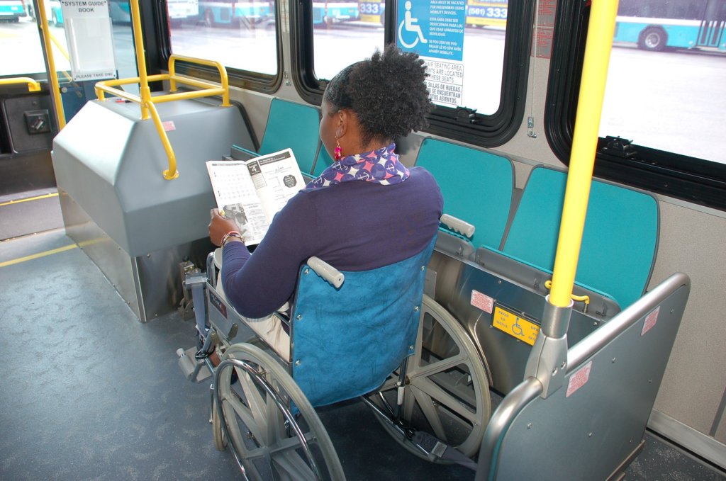 State & Federal guidelines require that all individuals using mobility devices – such as a wheelchair or an electric scooter chair/power chair – be properly secured via a four-point harness system. This system uses special harnesses to secure the mobility device so that it does not shift while the bus is in motion.