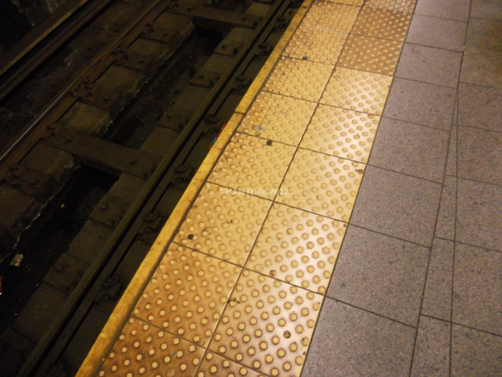 - While I’ve discussed the subject of the yellow safety line on board the transit bus, it takes on a slightly different context when relating to passenger rail networks. Here, the safety line is to indicate the edge of the elevated platform so that you don’t accidentally fall onto the tracks. While many systems indicate the platform edge via a yellow line, some may indicate this via a blue, orange, or red line. In order to comply with accessibility laws, these platform edge markers are often comprised of ribbed surfaces so that those with visual impairments can be alerted.
