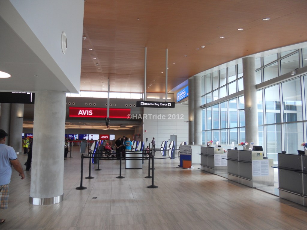 While this service is primarily geared towards those who are renting cars at the airport, it does wonders for public transit users as well. In many cases, you can check into your flight, print your boarding passes, pay any applicable bag fees, print your luggage tags, & bring your bags over to the check-in scales to be weighed & then transported onto a special conveyor that whisks your checked luggage straight to the main terminal, then your respective airside concourse for screening & loading onto the plane – all in one convenient location!