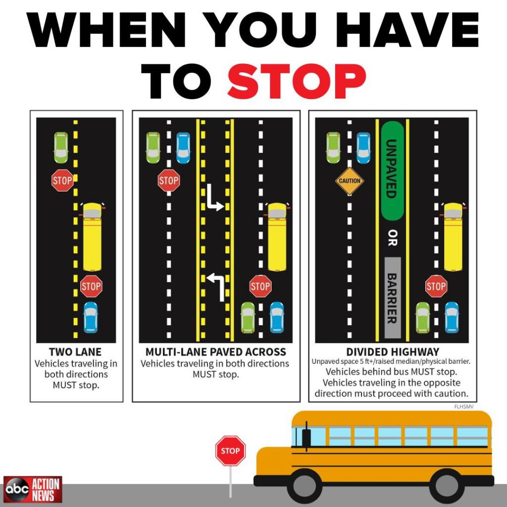 As depicted by the above graphic, in most circumstances – traffic in BOTH directions MUST STOP for the school bus when it is stopped (& its red lights are flashing & signs are extended out). When travelling on a divided highway (either with a grassy median that is 5 feet wide or greater, or a concrete barrier), traffic travelling with the bus will need to stop, whereas traffic in the opposite direction will not. However, traffic in the opposite direction will still need to use caution when traveling.