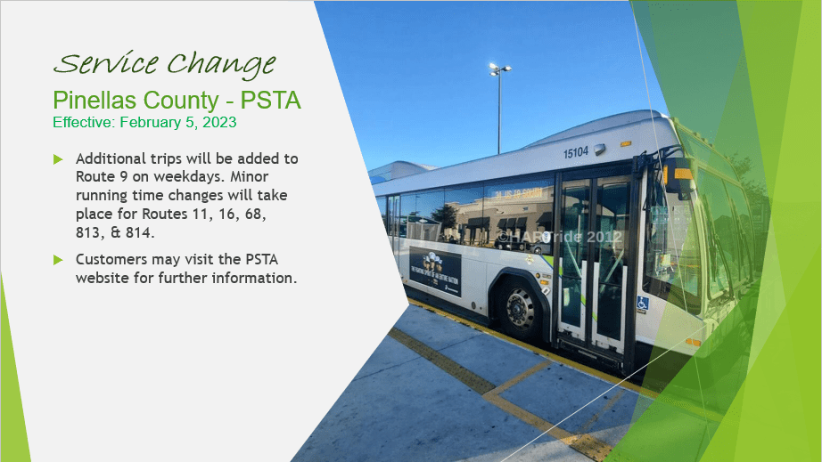 The Pinellas Suncoast Transit Authority (PSTA) will be enacting scheduling changes on Sunday, February 5, 2023. While most of the changes will be limited to minor running time changes to help improve on-time performance, Route 9 will see the addition of a couple of new early AM runs during weekdays.