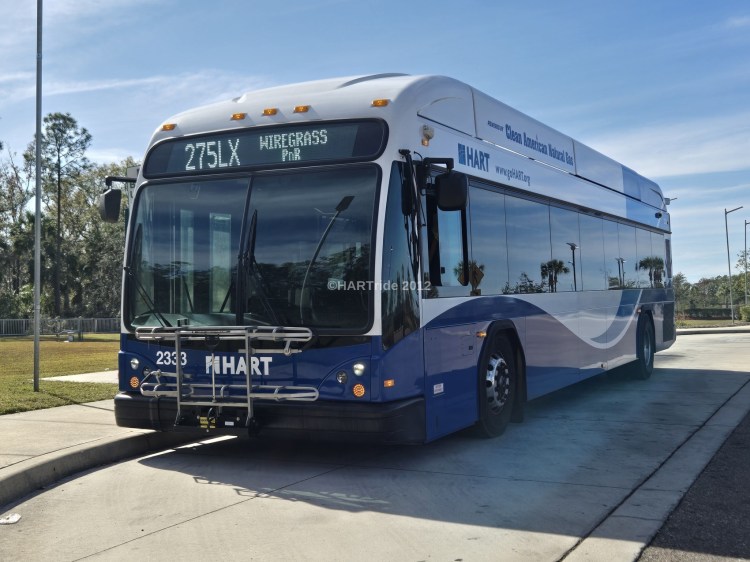 A HART bus on layover outside of the Shops at Wiregrass.