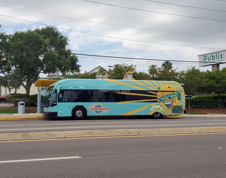 Elsewhere on the GTG site, I’ve mentioned about PSTA’s plans in 2023 to order another three buses for the SunRunner to add onto the nine initial buses that were ordered when service began in 2022. These additional buses will ensure that the SunRunner is able to continue operating every 15 minutes during the day while keeping a healthy spare bus ratio. The initial buses – manufactured by Gillig in Livermore, CA in 2021, are numbered 21101 through 21109. As the SunRunner became more popular, instances of regular 35′ buses being inserted onto the route became more commonplace – causing a slightly downgraded experience for customers. The new buses – while built in 2024 – are numbered 21110, 21111, & 21112 to keep continuity in the overall series for this dedicated fleet. Since the units entered service in May, substitutions by regular buses have become all but a rarity.