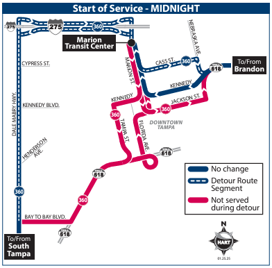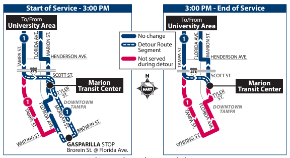 - After 1:00pm until about end of service, buses will detour using Dale Mabry Hwy & I-275.