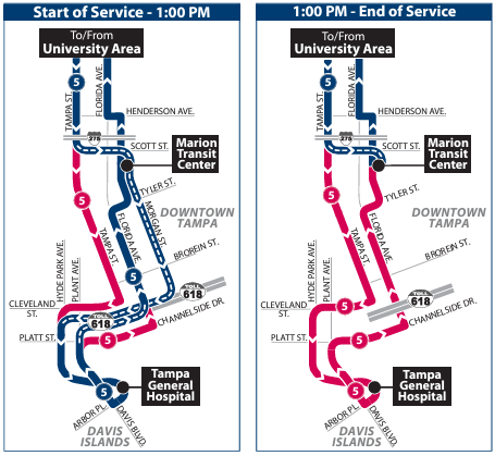 - From regular (Saturday) start of service, until about 1:00pm; buses will use the Selmon Exwy to connect between Hyde Park Ave/Plant Ave & Florida Ave/Morgan St.