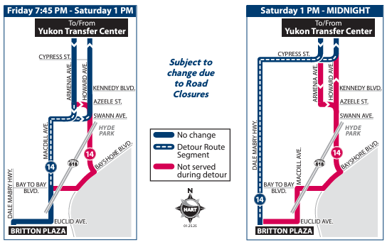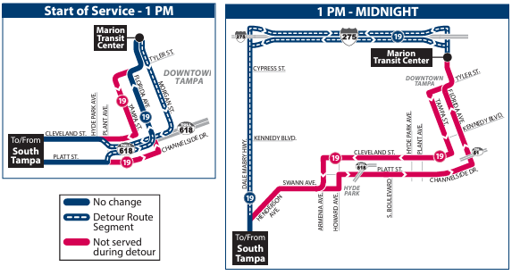 - After 1:00pm until end of service, buses will detour using Dale Mabry Hwy & I-275. Swann Ave & the Hyde Park area will not be served.