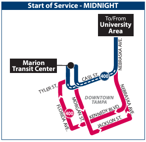 - From regular (Saturday) start of service, until about 3:00pm; buses will travel via the map illustrated on the left. A temporary stop will be set up at Brorein St & Florida Ave to allow Gasparilla attendees to exit.