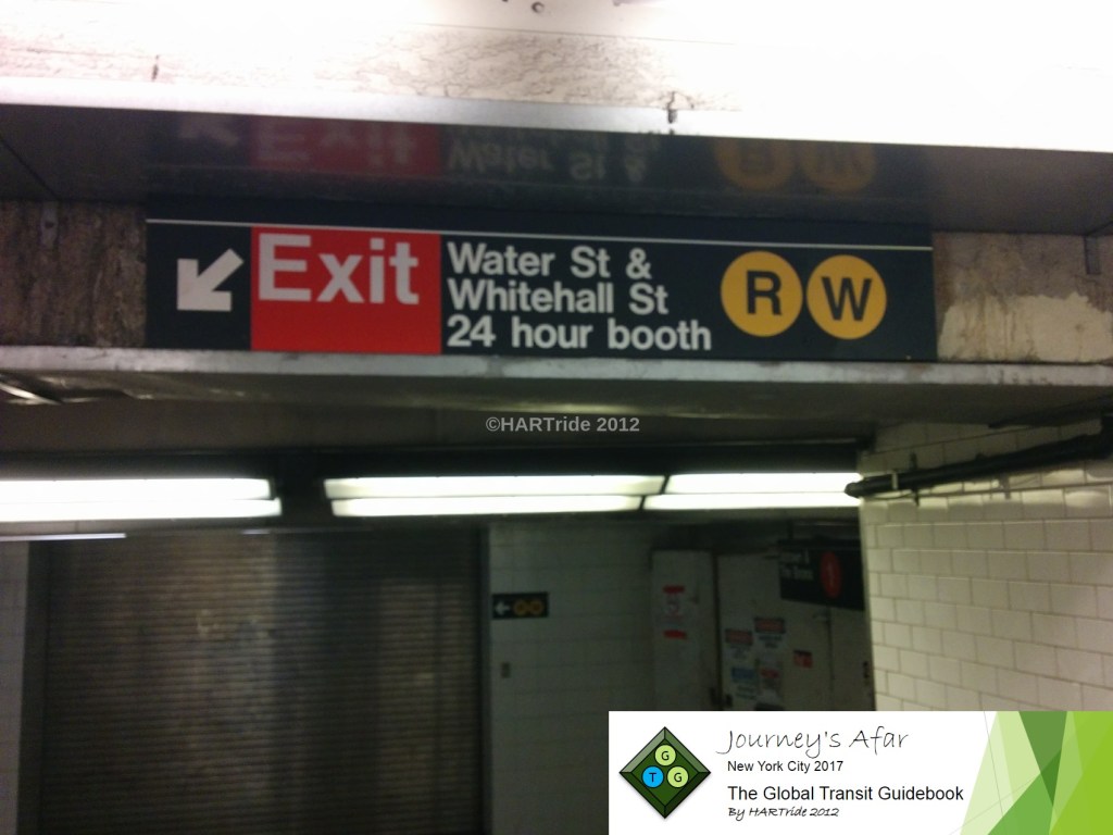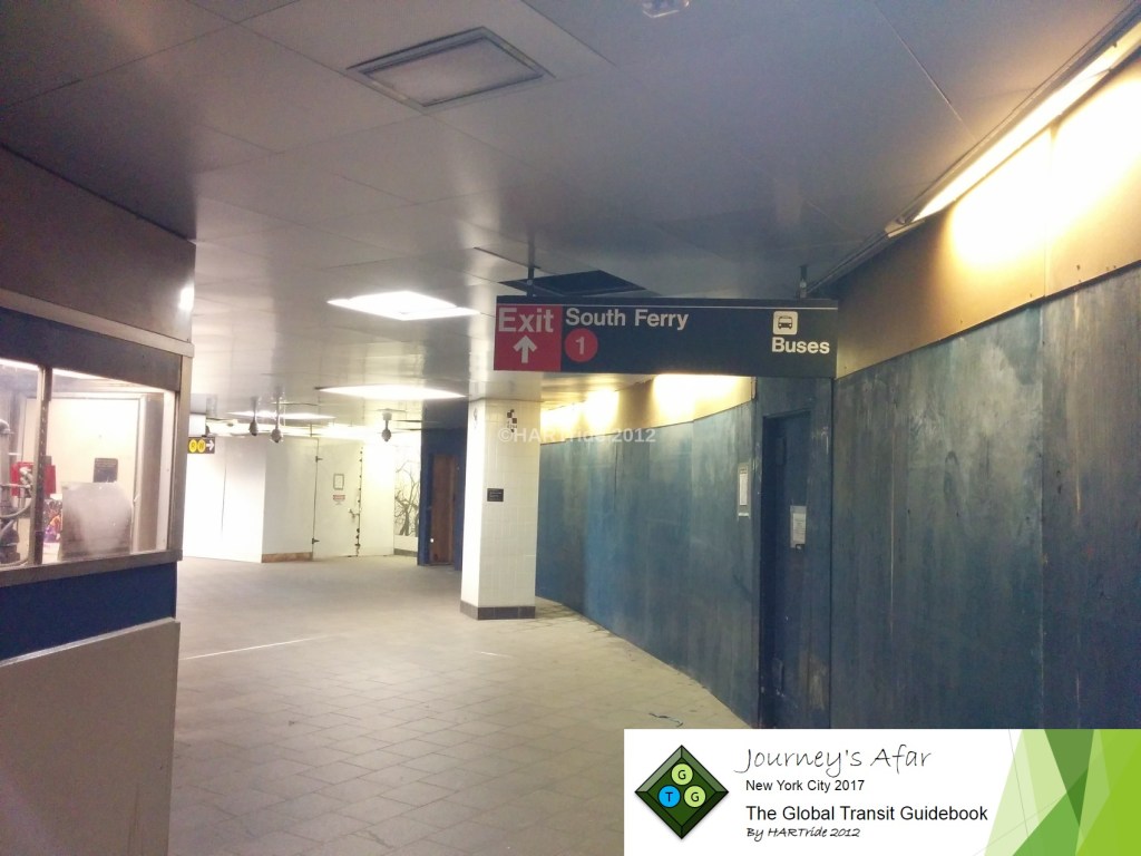 - 2017: Whitehall St platforms > Mezzanine level (inside fare control only) > South Ferry Inner Loop Platform.