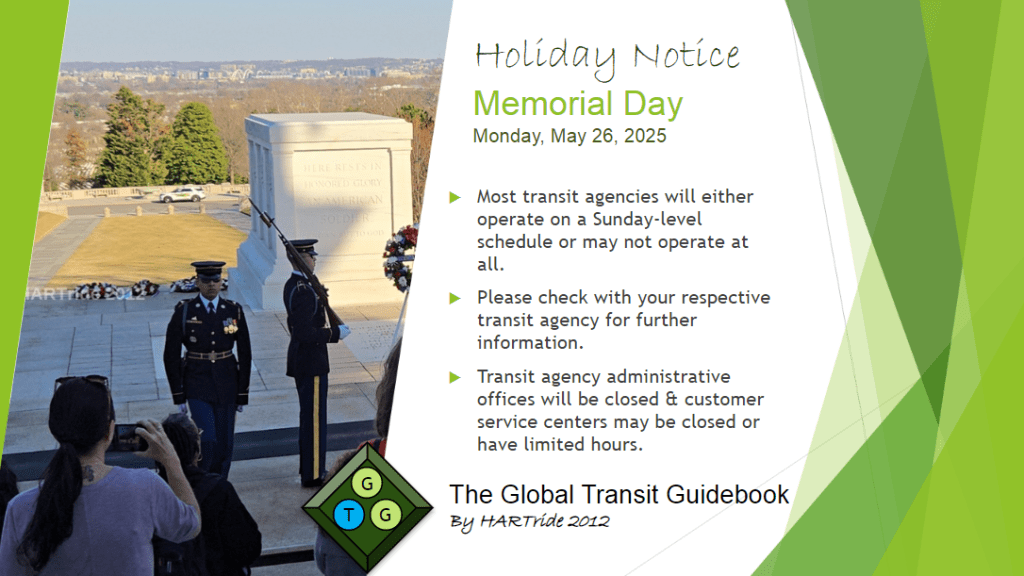 The Memorial Day holiday (Monday, May 26, 2025) gives us the chance to remember all those in the US military who lost their lives while defending our country’s freedoms. Being that Memorial Day is a national holiday, many transit agencies will be operating limited to no service & transit agency administrative offices will be closed.