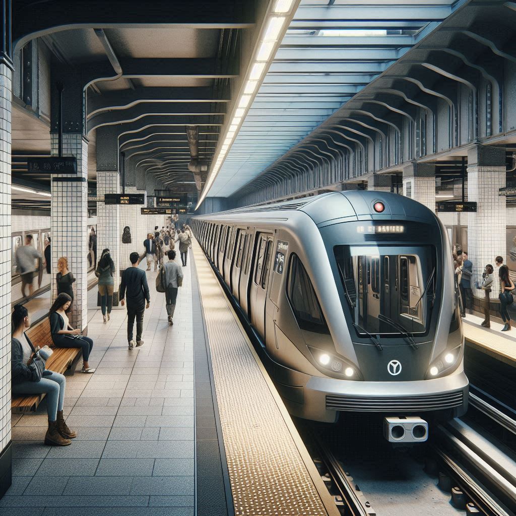A Capitol Subway train enters the 57th Ave / Main St Station. This image was created with Microsoft 365 Copilot.