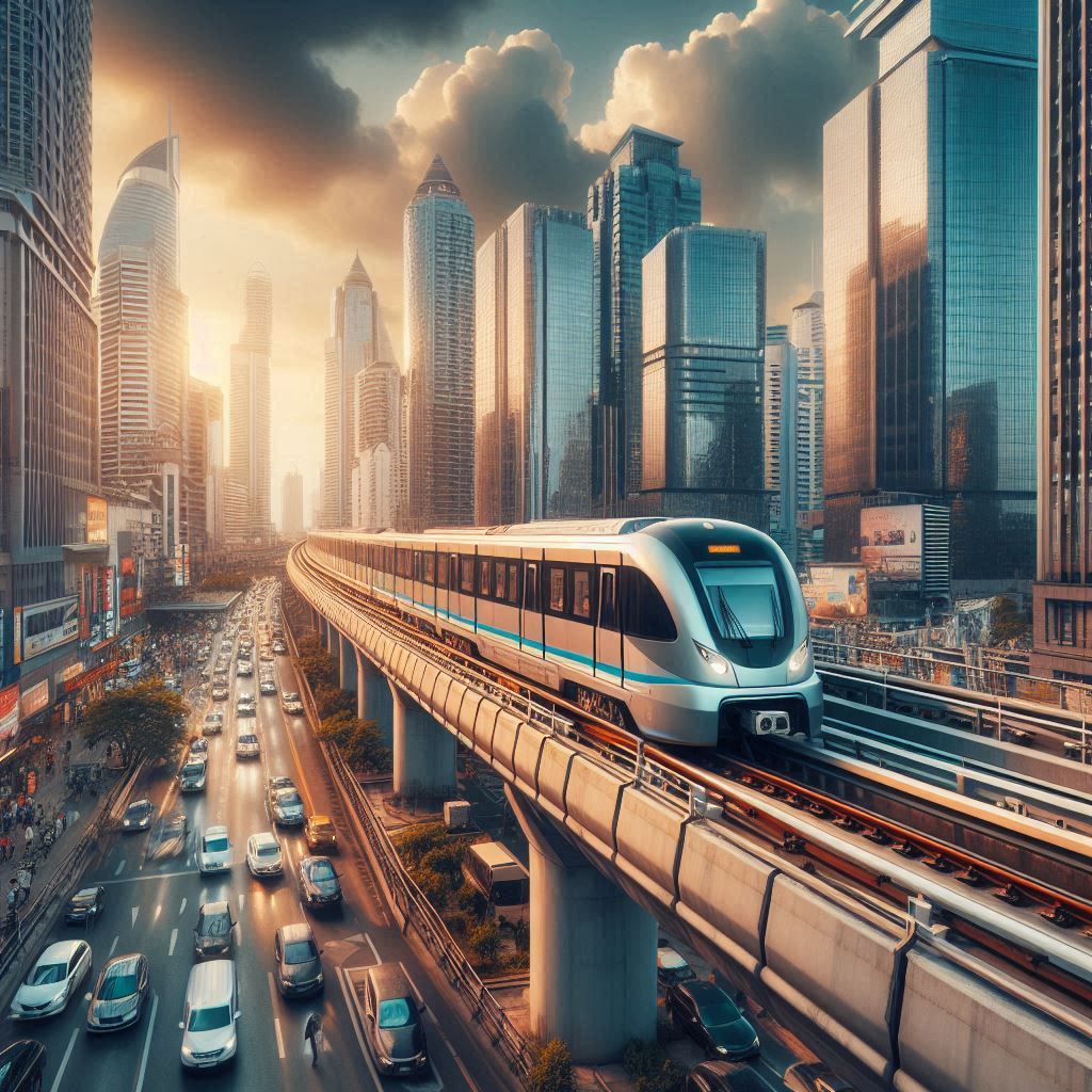 An elevated heavy rail train soars over traffic in the northern business district of Patsyville. This image was created with Microsoft 365 Copilot.