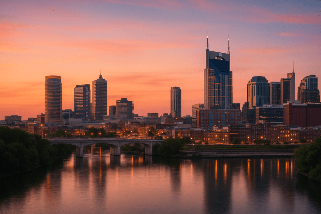 The downtown Cindyville skyline as it would appear during sunrise, with the Cindyville River in the forefront. This image was created with ChatGPT.