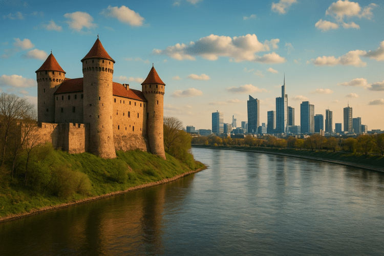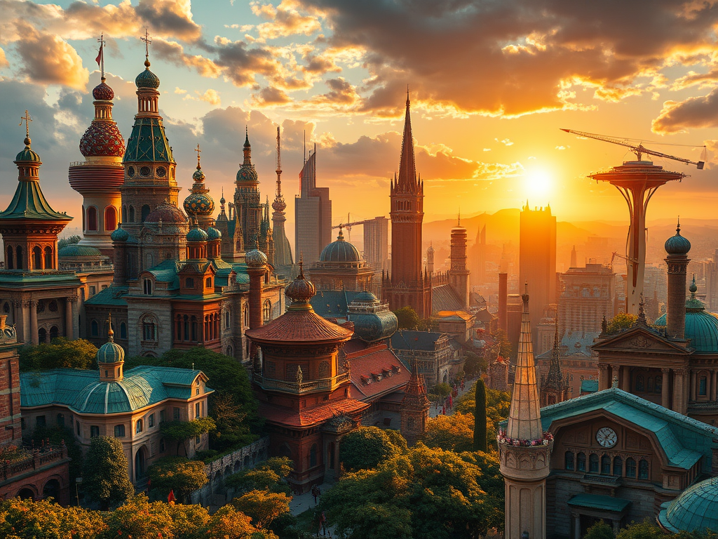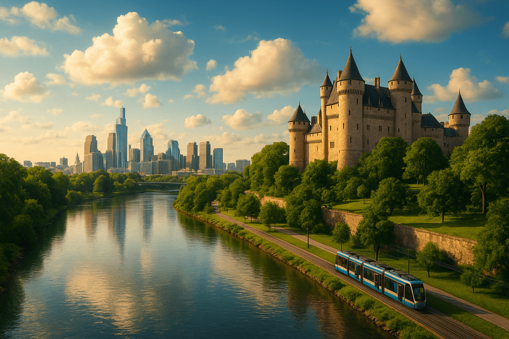 The skyline of The Capitol metropolis during sunset, with the Richardson Castle in the foreground. It’s not necessarily what I envisioned in comparison to how the actual street grid is laid out, but it’ll have to do for now. This image was created with ChatGPT.