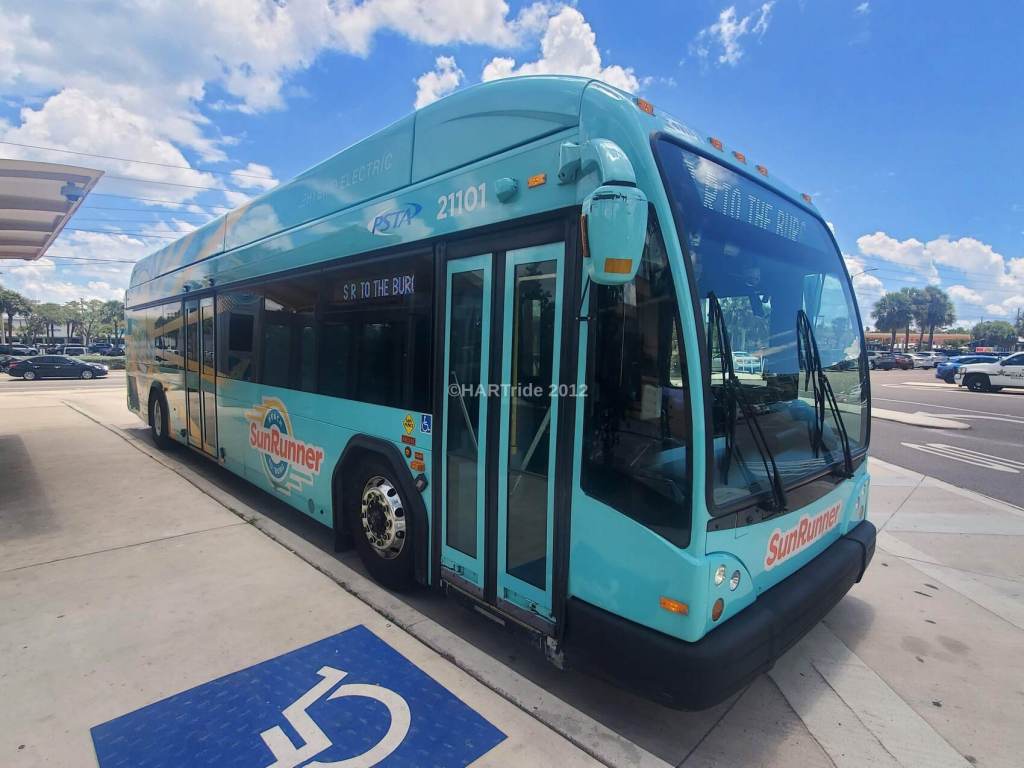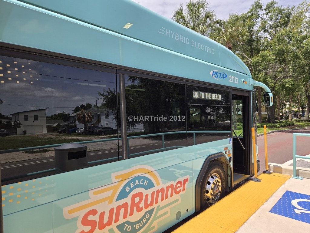 To help maintain a healthy spare ratio, PSTA ordered three more BRT Plus hybrid buses in 2023 to support SunRunner service during the week. These buses were produced during the beginning part of 2024 & delivered to the agency as of 03/25/2024. The buses entered service in May, 2024 & are numbered as 21110, 21111, & 21112 – following the 21XXX series instead of being assigned 24XXX unit numbers. When needed, the 2025 3rd batch battery electrics (#’s 26108 through 26119) may be used on the SunRunner to supplement service or substitute for unavailable units. Likewise, other battery electric units may be used when needed as substitutes. 35′ hybrid units are only used as a last resort substitution.