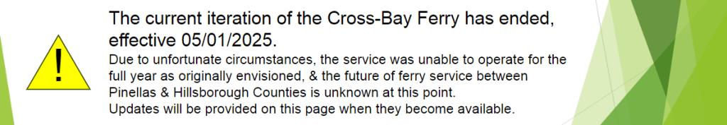 The 2024/2025 service schedule formally kicked off on October 4, 2025 & marked the first year that the ferry would attempt to operate for a full calendar year. Due to unfortunate circumstances surrounding use of the ferry vessel, service was truncated to end on April 30, 2025, with the city of St. Petersburg & Hillsborough County terminating their contracts with HMS. While there is support for some sort of longer-term ferry service between Hillsborough & Pinellas Counties, whether any plan becomes solidified remains to be seen.